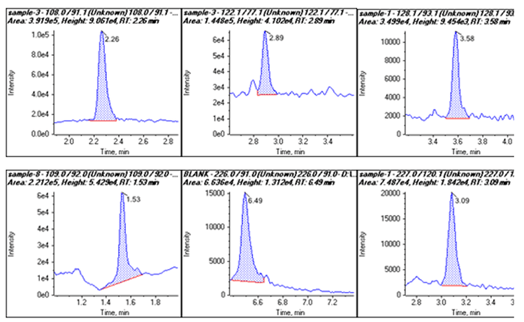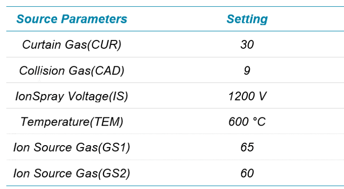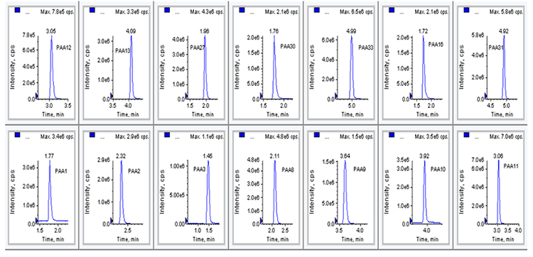 Source parameters were optimized for the best sensitivity. During the optimization, it was found that the IonSpray Voltage optimized at 1200 V for the best sensitivity of all PAAs (Figure 3).