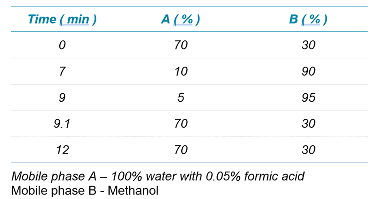 Chromatography: Compound separation was performed using the ExionLC™ AD System with a Phenomenex Kinetex F5 column (2.6 μm F5 100 Å, 100 X 3.0 mm). The flow rate was 0.3 mL/min, column temperature was 40 ºC and the injection volume was 5 μL. Gradient conditions are shown in Table 1.