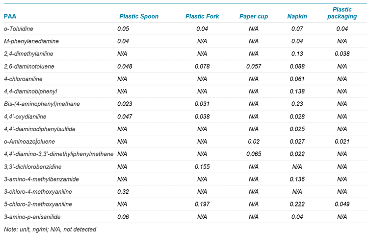Some PAAs are detected in some of the samples, but total concentrations of PAAs in all samples were lower than 10 ng/mL, not exceeding the limit of total PAA in the EU plastic FCM Regulation (EU) No 10/2011. Figure 4 shows the chromatograms of some detected PAAs.