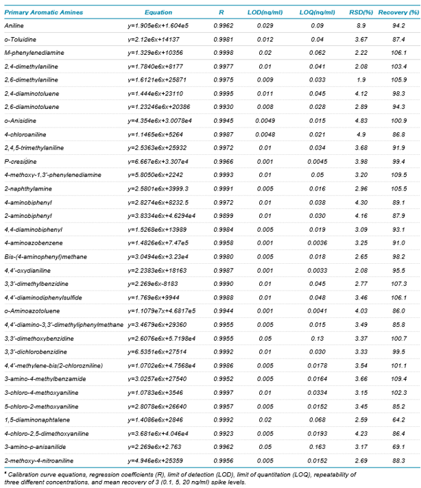 The linearity of instrument response evaluated in a concentration range between 0.05 and 50 ng/mL showed very good regression coefficients for all the PAAs (Table 3). LODs were in the range of 0.001-0.029 ng/mL for 33 PAAs. LODs were lower than the limit of total PAA of 10 ng/mL in the EU plastic FCM Regulation (EU) No 10/2011.