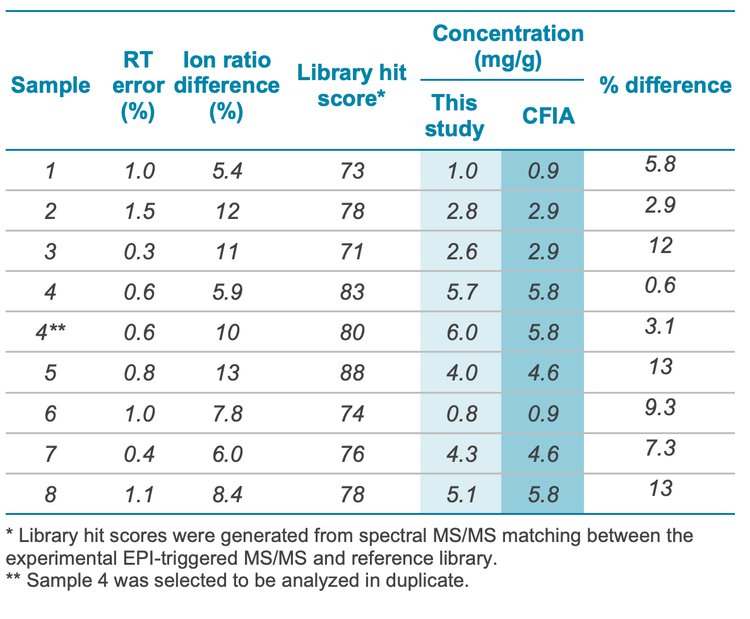 In addition to comparing RTs and ion ratios between the unknowns and standards, AC identification was also supported by spectral MS/MS matching against the SCIEX Natural Products HR-MS/MS library (Figure 1 and Table 5). While ion ratios have established acceptance criteria for compound identification,6 false positives or false negatives may still occur especially at low concentrations or in complex matrices. As an alternative, full-scan MS/MS spectra acquired by EPI scans are rich in fragments and provide a molecular fingerprint for each compound that can be searched against a reference library or published databases.7