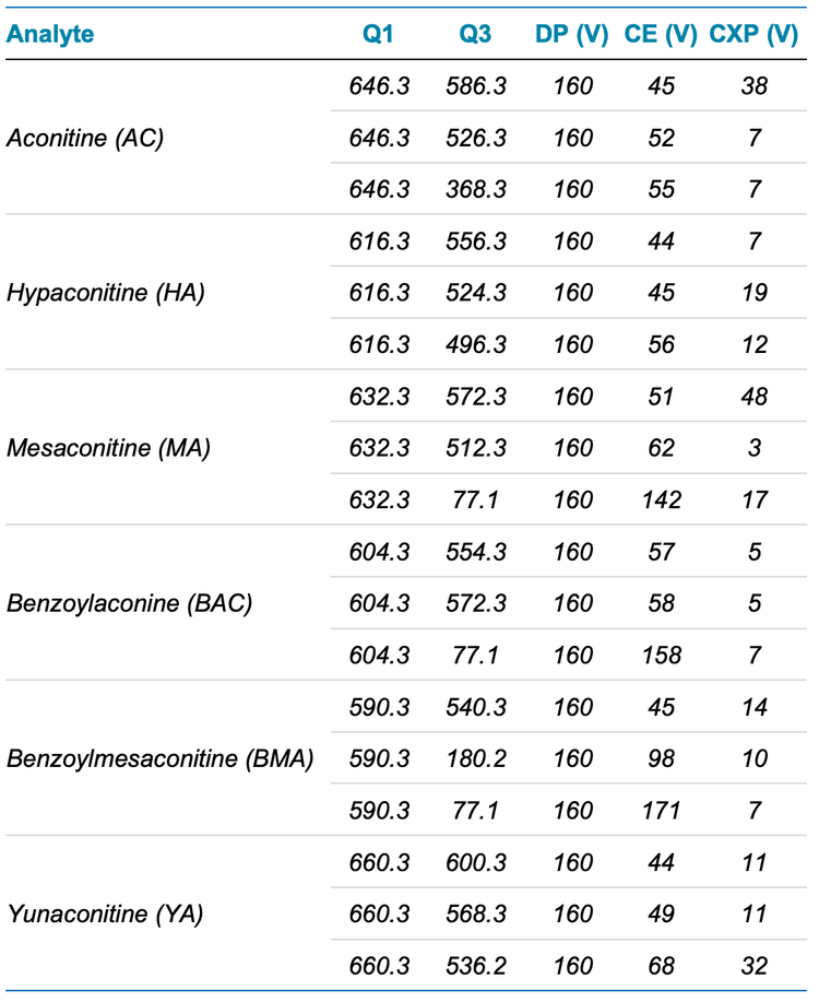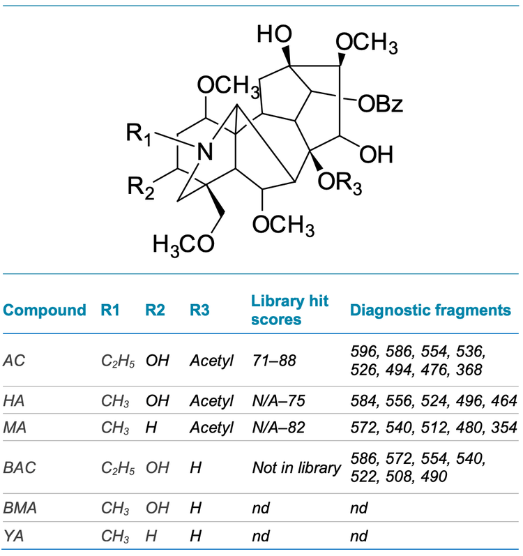 Chemicals and samples: The neat standards for aconitine (AC), hypaconitine (HA), mesaconitine (MA), benzoylaconine (BAC), benzoylmesaconine (BMA) and yunaconitine (YA) were purchased from Toronto Research Chemicals. Individual neat standards were mixed to prepare stock solutions in acetonitrile from which calibration standards (0.05–100 ng/mL) were prepared in 50:50 (v/v), methanol/0.1% formic acid in water.