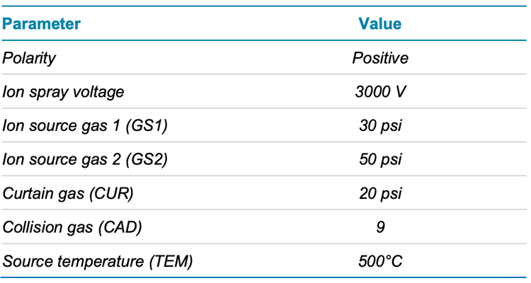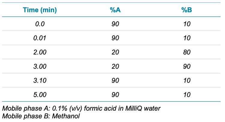 Chromatography: LC separation was performed on a Shimadzu Nexera LC-40 system using a Phenomenex Gemini C18 column (100 x 2 mm, 3 µm, P/N 00D-4439-B0). A flow rate of 0.5 mL/min, an injection volume of 1 µL and a column temperature of 40ºC were used. The LC conditions used are shown in Table 1.