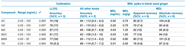 The MDL is defined as the lowest measured concentration of an analyte that can be reported with 99% confidence as distinguishable from the method blanks.5 MDLs were calculated by extracting 9 replicate sand ginger samples spiked at 5 ng/g, followed by dilution to yield in-vial concentrations at 2x the LLOQ.5 The MDL was calculated by multiplying the standard deviation from the 9 replicates by the t-value (2.896) at the 99% confidence level, as follows: