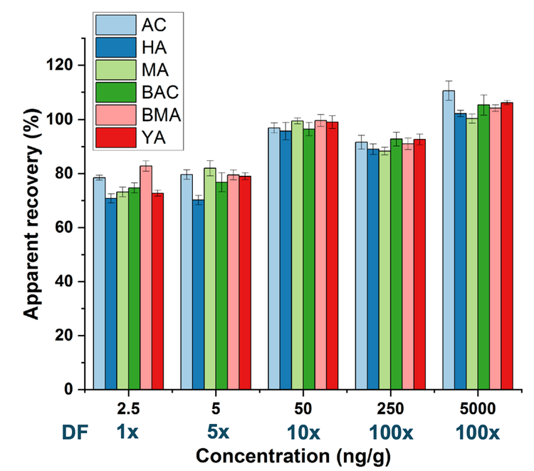 Due to the high levels anticipated in real-world adulteration, recoveries were also assessed at higher spiking concentrations. Excellent recoveries within ±15% of the nominally spiked concentration were achieved at the higher spiking concentrations (≥50 ng/g), while recoveries were within ±30% at the near-MDL levels (Figure 6).