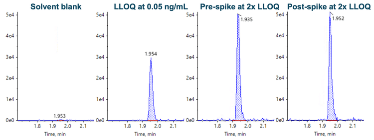 The calculated columns feature in SCIEX OS software enables the user to directly perform calculations in the results table instead of transferring the data elsewhere. The in-vial MDLs were natively calculated within the software, followed by conversion to the mass-based MDLs based on the dilution factor, extraction solvent volume and original sample mass. Apparent recoveries within ±30% of the nominally spiked concentration and %CV <15% were achieved in the MDL spikes (Table 4). Absolute recoveries of 90–104% (%CV <10%, n = 9) were also calculated based on the quotient of the peak areas in the pre- and post-spiked extracts (Table 4). Figure 4 compares the XICs of the solvent blank, LLOQ standard and the pre- and post-spiked extract, all of which exhibited good peak area responses at near-MDL levels.