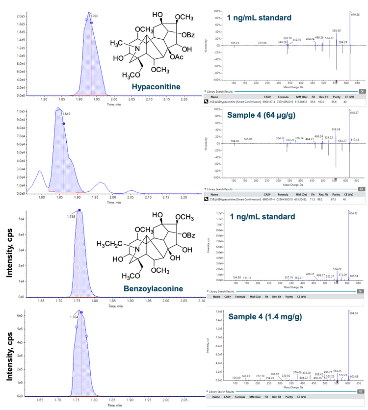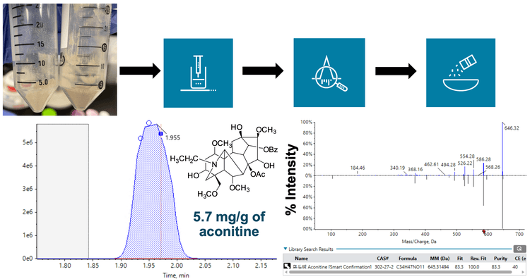 Diester-diterpenoid alkaloids (DDAs) such as AC are the active pharmaceutical components in Aconitum or aconite herbs, which are used for their anti-inflammatory, analgesic and cardiotonic effects.1 However, without proper processing to transform these DDAs into the less toxic monodiester alkaloids (MDAs), oral consumption can lead to poisoning where the minimum lethal dose range has been reported to be as low as 2–6 mg in humans.2 Inadequate processing, contamination and erroneous substitution contributed to aconitum poisoning cases previously reported in Hong Kong, Taiwan, China and Korea.1 AC was recently identified as the toxin responsible for 2 food poisoning incidents in Ontario and British Columbia, Canada.3 In both cases, the victims fell ill after consuming sand ginger, which was later discovered to be adulterated with aconite. Due to the severity of the symptoms and the need for a quick turnaround time, the CFIA developed a rapid procedure for quantifying AC in the suspect samples by LC-MS/MS. In this work, the method was extended to include additional alkaloids, other spice powders and spectral MS/MS acquisition for compound confirmation.