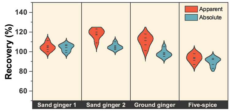 Sample preparation: The spice powder samples were extracted based on a method developed by the CFIA. Briefly, 1 g of sample was extracted with 10 mL of 75:25 (v/v), methanol/2% formic acid in water by shaking for 1 hour, followed by sonication for 10 minutes. After centrifuging at 4500 rpm for 10 minutes, aliquots of the supernatant were diluted with 50:50 (v/v), methanol/0.1% formic acid in water at varying dilution factors to ensure the resulting peak area response fit within the calibration curve. Water and unspiked spice powder were extracted in the same manner as reagent and procedural blanks, respectively. Sand ginger was spiked at 5 ng/g to calculate the MDLs as well as 4 different concentrations ranging from 2.5 to 5000 ng/g to assess the impact of dilution on matrix effects. Recoveries were also assessed in the other spice powders spiked at 5000 ng/g.