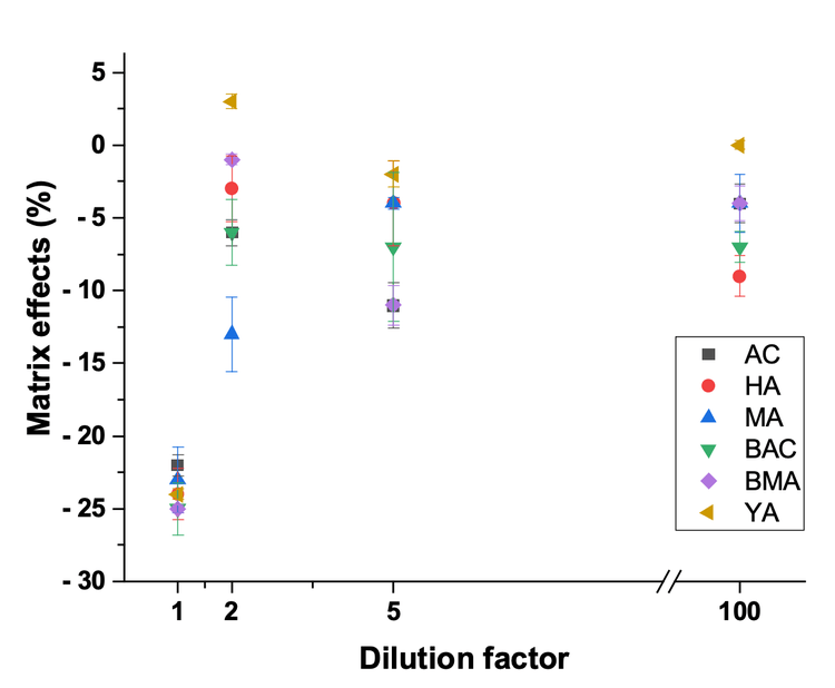 Extensive dilution was required for the high concentrations expected in the adulterated spice powders. However, samples with low-level contamination may not require significant dilution or can be directly injected. Therefore, experiments were performed to assess the impact of matrix effects on quantitation. Post-spiked sand ginger extracts at concentrations of 2.5–5000 ng/g were diluted to a varying extent to assess matrix effects based on the following: