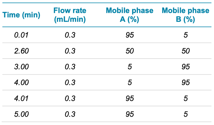 Chromatography. LC separation was performed using a Nexera XR LC instrument and a Phenomenex Luna 3 µm PFP (2) 100 Å (2.0 × 150 mm) column. Mobile phase A was water with 0.1% formic acid by volume and 5mM ammonium acetate. Mobile phase B was 95:5 (v/v) acetonitrile/water with 5mM ammonium acetate and 0.1% formic acid by volume. The gradient ramped from 5% to 95% mobile phase B. The gradient conditions used are shown in Table 1. A flow rate of 0.3 mL/min and an injection volume of 10 µL were used.