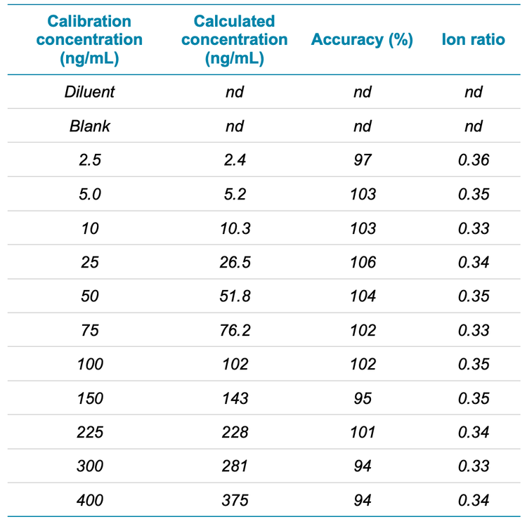 - Acceptable accuracies (88%-98%) and precision <6 %CV were observed for QC spikes. The matrix-matched calibration yielded linearity with an r >0.99 for both quantifier and qualifier transitions.