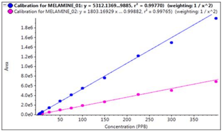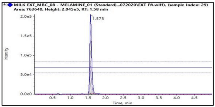 - Confident analyte detection and quantification in the milk matrix were achieved using 2 selective MRM transitions for melamine