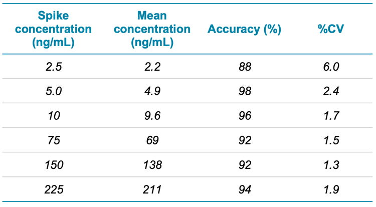 - Excellent precision and accuracy were observed, with %CV values <6% for QC samples (n=6) and accuracies between 94-106% for matrix-matched calibration standards