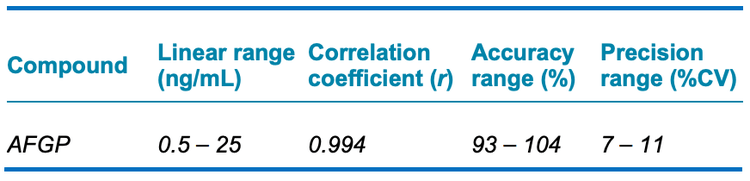 Chemicals and samples: A neat standard of AFGP was used to prepare stock solutions in methanol. From the stock solutions, calibration standards (0.5–25 ng/mL) were prepared using an aqueous solution of 2mM ammonium formate as diluent.