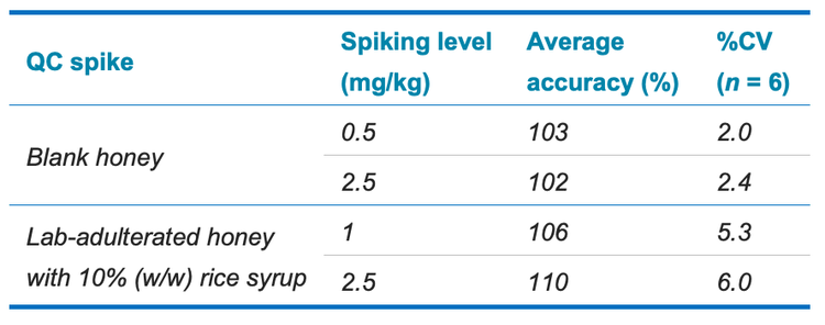 - Acceptable ion ratios (±20%), accuracies (70–130%) and precision values (%CV <15%, n = 6) were achieved in quality control spikes prepared in honey and lab-adulterated honey