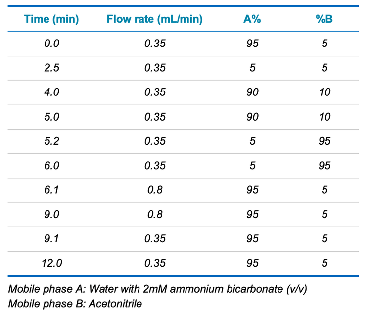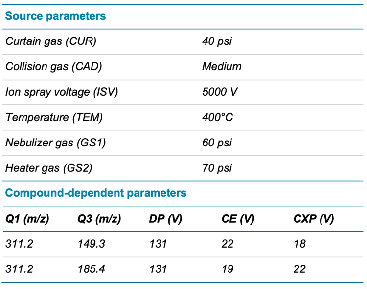 Chromatography: LC separation was performed on an ExionLC AD system using a Phenomenex Gemini-NX C18 column (3 µm, 100 Å, 100 x 3 mm, P/N: 00D-4453-Y0). A flow rate of 0.35 mL/min, an injection volume of 5 µL and a column temperature of 35°C were used. The gradient is presented in Table 1.