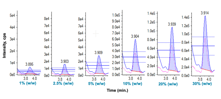 Previous investigations of honey authenticity have typically used a spiking range of 10–50% (w/w) rice syrup to artificially simulate honey adulteration.3-5 Here, adulteration was assessed by blending honey with rice syrup at levels ranging from 1% to 30% (w/w) (Figure 6), with the intention of mimicking real-world fraudulent practices of honey manufacturers. The AFGP response demonstrated a linear increase (r = 0.996) with the level of adulteration. The concentrations of AFGP ranged from 0.14 mg/kg to 3.2 mg/kg. The method easily quantified AFGP at the lowest blend percentage of 1% (w/w) with consistent ion ratios (±20%) and signal-to-noise (S/N ≥20) for both the quantifier and qualifier transitions. This suggests the current dilute-and-shoot method provides sufficient sensitivity to quantify AFGP below levels typically used for adulteration (≥10%).3,4