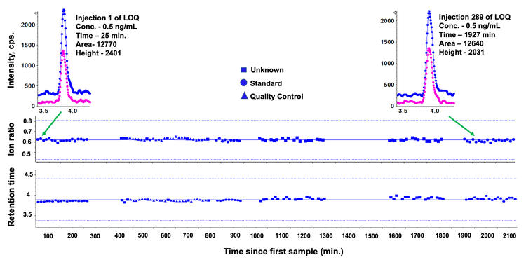 The method robustness was assessed by an acquisition batch comprised of >300 injections which corresponded to >35 hours of runtime. The metric plots generated by SCIEX OS software indicated that the ion ratios were consistent and the retention times were within ±30% of the mean throughout the batch (Figure 5). The LOQ standard injected at the start and the end of the batch demonstrated similar peak area responses even after the injection of 300 samples of variable complexity, such as solvent blanks, honey and lab-adulterated honey blended with rice syrup. These results highlight the robust performance of the method over a long period of time, even when analyzing complex honey matrices.