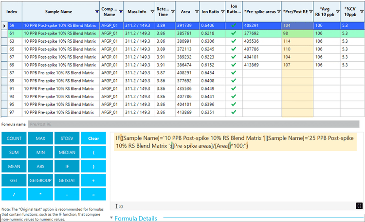 A blank honey matrix and honey blended with 10% (w/w) rice syrup were spiked with AFGP before and after sample preparation to evaluate procedural recoveries at concentrations near the FSSAI MRPL of 1 mg/kg.6 Acceptable matrix recoveries of 102–110% with %CV of 2–6% for 6 replicates at each spiking level were achieved based on the quotient of the peak areas in the pre-and post-spiked samples (Table 4). This calculation was performed directly in the results table using the calculated columns feature in SCIEX OS software, as shown in Figure 4.