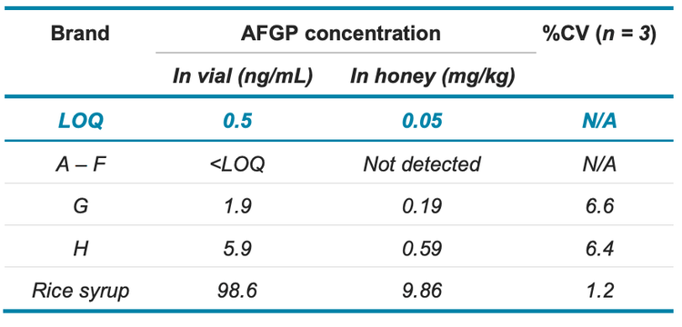 - Application of the method successfully detected AFGP in honey adulterated with as little as 1% (w/w) rice syrup