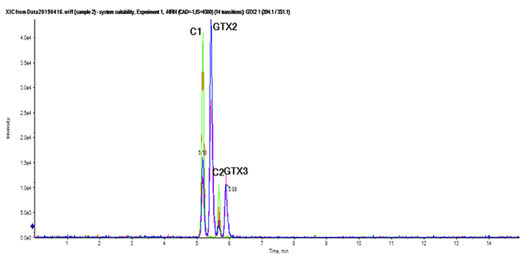 For each analyte, two signature MRM transitions were chosen to ensure confidence in the identification of each PSTs (Table 2). Typical chromatograms of solvent standard are shown in Figures 2 and 3. The LC peak quality demonstrated by the method resulted in excellent quantitative accuracy and reproducibility. The system suitability was tested with standard concentrations of 5 and 50ng/mL, and the standard solution was injected three times to assess precision. The %RSD of each analyte peak was calculated to less than 15%. The matrix matched linearity was evaluated. To account for matrix inhibitory effects, matrix matched curves were used to quantify the unknown samples. For STX and GTX4 as example analytes, the method was found to have acceptable reproducibility and the linear regression coefficient was found to be greater than 0.99 (Figure 4).