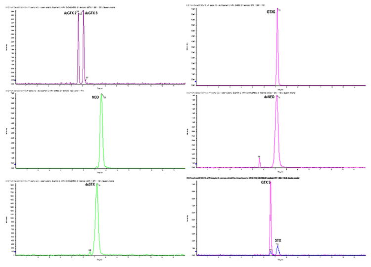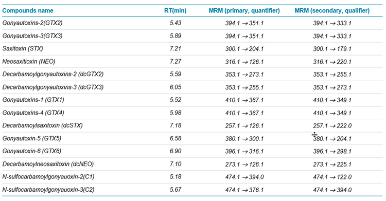 Sample preparation: Samples (clam, scallop, mussel etc.) were first homogenized and 5.0g of sample was extracted using an acetic acid solution in water. Once sonicated and centrifuged, the supernatant was passed through a Cleanert® PEP-2 Cartridge (Agela Technologies, P/N PE0603-2). The filtrate was for LC-MS analysis.
