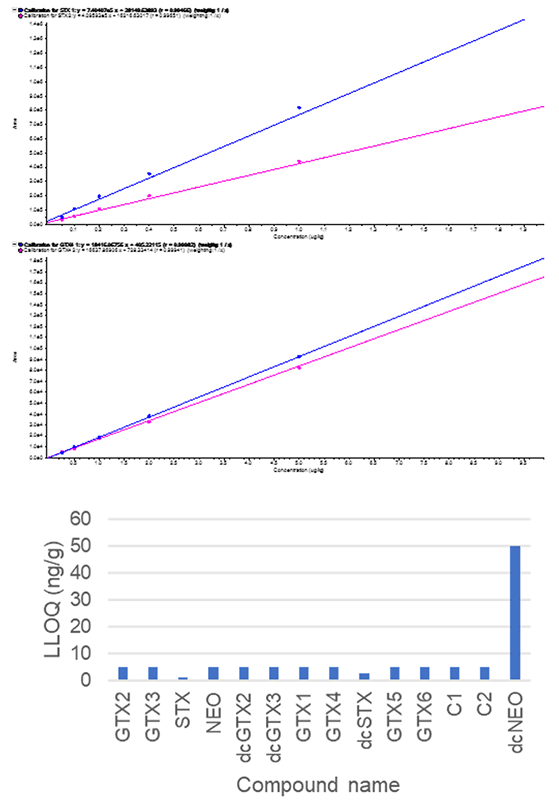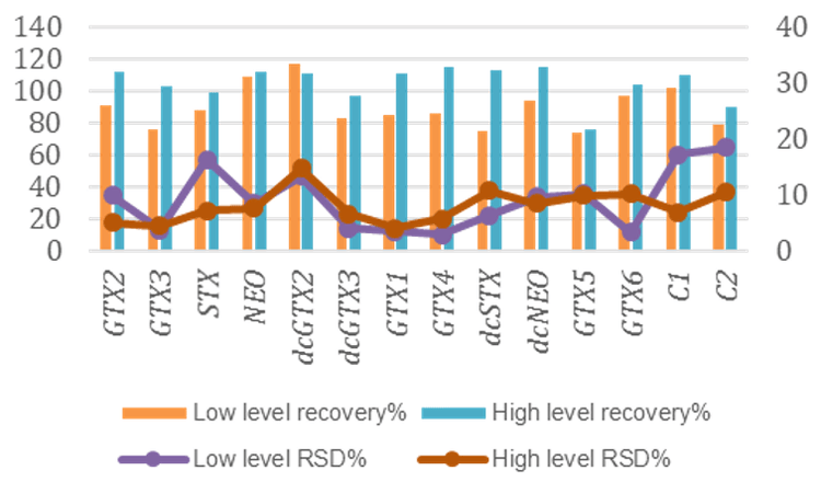 According to the different sensitivity levels of each compound on the instrument, the limit of quantitation was evaluated and the LOQ of all targeted PSTs were between 1ng/g and 50ng/g. The recovery of low and high concentration spiked sample was between 70% and 120% (Figure 5). LLOQ was defined as the lowest concentration at which the signal-to-noise was at least 10 and accuracy achieved to 100±30%. LLOQs of the paralytic marine toxins were found between 1ng/g and 50 ng/g.