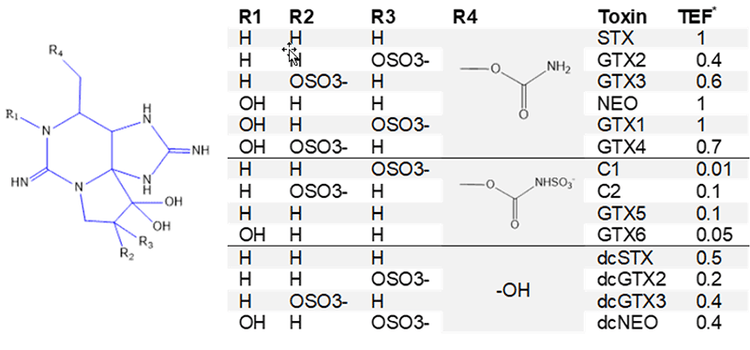 Paralytic Shellfish Toxins (PSTs) are a class of potent neurotoxins produced by a range of marine microalgae belonging to the genera Alexandrium, Gymnodinium and Pyrodinium. When these harmful algae are eaten by shellfish, the toxins naturally accumulate in shellfish and can pose a serious threat to the health of shellfish consumers in many parts of the world. To protect public health, the worldwide regulatory limits for PSTs in shellfish were set at 800 μg STX eq/kg (European Commission (EC) No. 853/2004).
