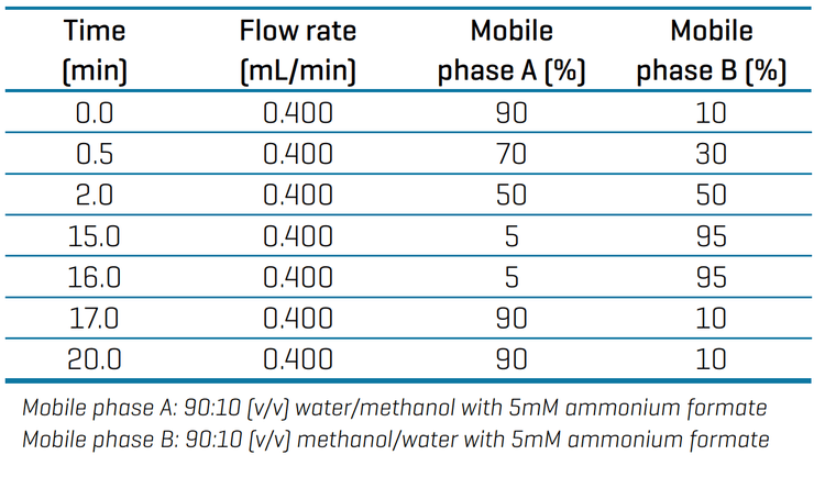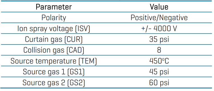Chromatography: Chromatographic separation was performed on an ExionLC AD system using a Kinetex Biphenyl column (2.6 μm, 100 mm x 3 mm, P/N 00D-4622-Y0). The flow rate was 0.4 mL/min, and the mobile phase and gradient conditions used are shown in Table 1. The injection volume was 10 μL and the column oven temperature was set to 30°C. The autosampler temperature was set to 10°C.