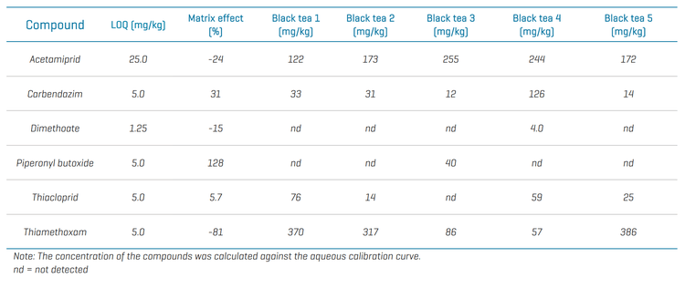 - Method applicability in commercial tea: Thiamethoxam, acetamiprid, carbendazim, thiacloprid and piperonyl butoxide were positively detected in 5 locally purchased tea samples.