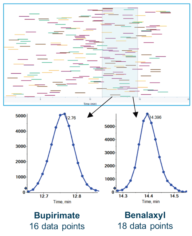 Standard preparation: The standard mix of 206 pesticides was purchased from TRC Canada. The intermediate stock solutions were prepared in 50:50 (v/v) of acetonitrile/water. Calibration standards were prepared in 90:10 (v/v) acetonitrile/water with 0.01% (v/v) formic acid at levels ranging from 0.025 to 50 ng/mL. In addition, matrix-matched calibration standards were prepared through post-extraction spikes, following the sample preparation procedure described below.