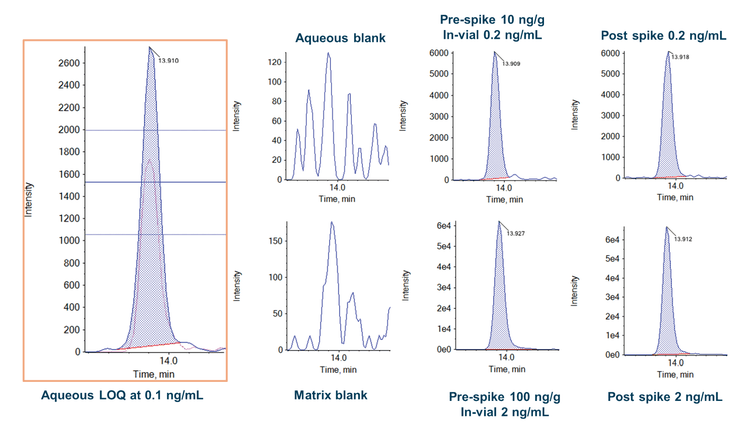 - Sub- to low-ng/mL in-vial LOQs (0.025-2 ng/mL) in both aqueous and matrix match calibration standards. In-sample equivalent LOQs ranged from 1.25 to 100 ng/g for the matrix-matched standards.