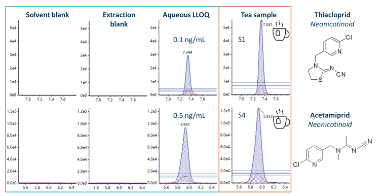 The sample preparation and LC-MS/MS method were applied to 5 tea samples purchased from a local store. Few pesticides were detected in the tea samples (Table 3 and Figure 6). The detected pesticides included acetamiprid, carbendazim, dimethoate, piperonyl butoxide, thiacloprid and thiamethoxam. Interestingly, most of the detected pesticides (acetamiprid, thiacloprid, thiamethoxam) were from the neonicotinoid class and may indicate the prevalent use of this pesticide class on tea. These pesticides were not detected in the procedural blanks, confirming their presence in the tea. The calculated concentrations in the tea range from the low- to 100s of mg/kg levels. However, the thiamethoxam concentrations are most likely not accurate due to the high matrix effects observed (- 81%).