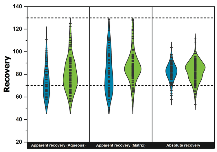 The apparent and absolute recoveries, and matrix effects were determined at the 10 ng/g and 100 ng/g spiking levels. The apparent recovery was calculated from the pre-extraction spike samples and quantified against either the solvent-based or matrix-matched calibration standards. When quantifying against solvent-based standards, the apparent recovery considers the analyte extraction recovery and matrix effects.