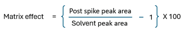 The matrix effects were assessed in the 100 ng/g spike samples since the apparent recovery experiments demonstrated improvement when quantifying against the matrix-matched calibration standards. The matrix effects were calculated based on the peak areas from the 100 ng/g post-extraction spike and the equivalent solvent calibration standards (2 ng/mL) using the following equation: