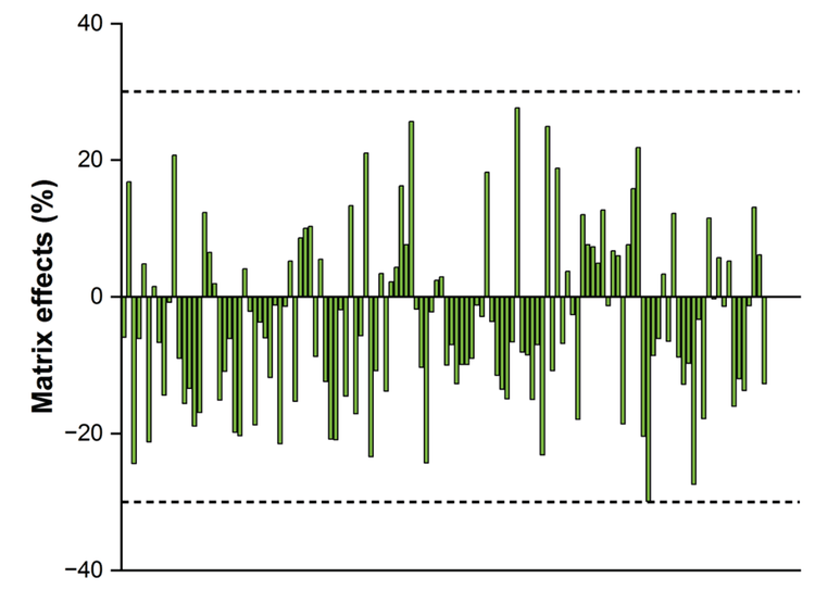 - Robust method performance in matrix spikes. Majority of pesticides showed good apparent and absolute recoveries, with further improvement observed for some pesticides when using matrix-matched calibration standards.
