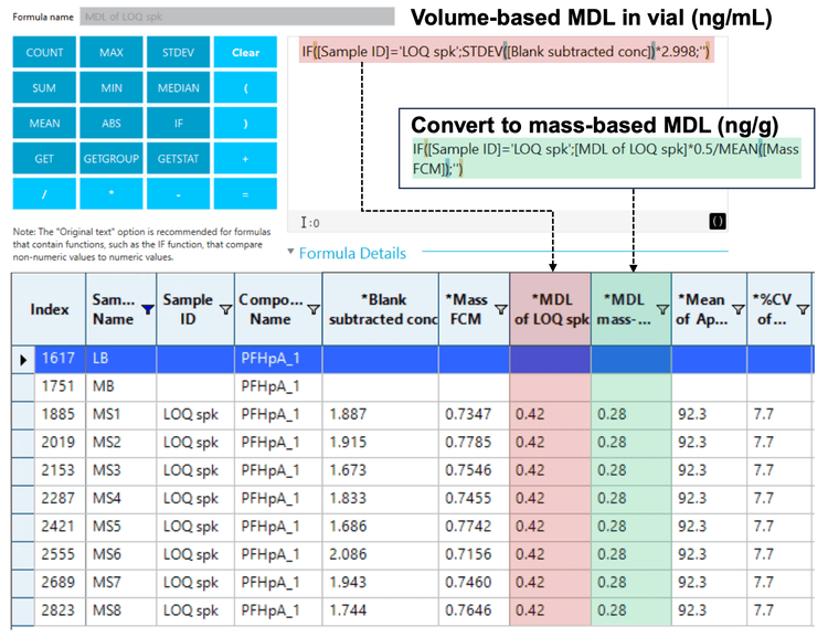 Figure 2. Screenshots demonstrating custom calculations in SCIEX OS software. Custom formulas (top) were used to calculate the volume- (red) and mass-based (green) MDLs of PFHpA from replicate spikes based on text-based and calculated columns in the results table (bottom).
