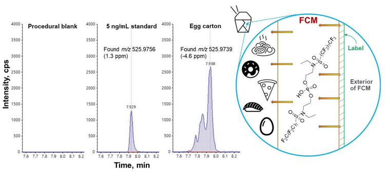 Both the diPAPs and diSAmPAP compounds were detected in a recyclable plastic clamshell box, a cardboard chocolate wrapper and an egg carton at concentrations ranging from 2.3 to 41 ng/g. The levels of diPAPs observed here are consistent with their use as greaseproofing agents in FCMs and with concentrations previously reported.2-5 In contrast, the detection of diSAmPAPs in the chocolate wrapper and egg carton, both of which were comprised of recycled paper fiber, was unexpected. The diSAmPAPs were historically used as FCM components until perfluorooctylsulfonyl (POSF)-based chemistries were phased out in North America in 2002,1 although production may still persist in Asia.9