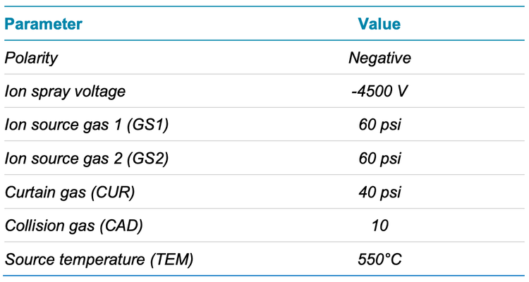 Mass spectrometry: Analysis was performed using the X500R QTOF system in negative electrospray ionization mode based on the source and gas conditions listed in Table 2.