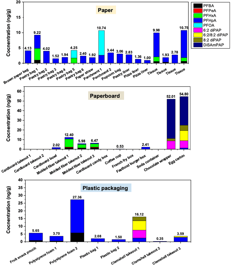 Figure 3. Concentrations of PFAS (ng/g) in 3 different types of FCMs. The total PFAS concentrations are listed at the top of each FCM sample. The total PFAS concentrations were calculated as a sum of the individual congener concentrations.
