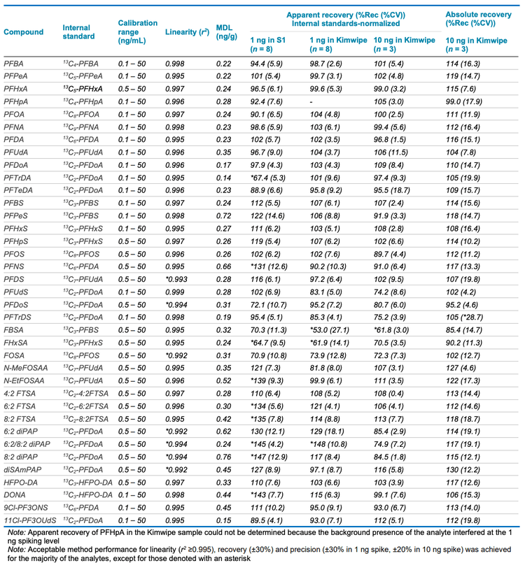 Due to the background presence of PFHpA in Kimwipes, MDL determination could not be performed at the required low levels in this matrix. Instead, absolute recoveries were determined by calculating the quotient of the peak areas in Kimwipes spiked before and after extraction to assess recovery loss. Overall, acceptable absolute recoveries of 80%–120% with %CV <20% were achieved for the majority of the analytes (Table 4).