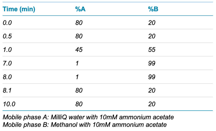 Chromatography: LC separation was performed on a SCIEX ExionLC AC system using a Phenomenex Luna Omega PS C18 as the analytical column (100 x 2.1 mm, 3 µm, P/N: 00D-4758- AN) and a Phenomenex Luna C18(2) as the delay column (50 x 4.6 mm, 5 µm, P/N: 00B-4252-EO). A flow rate of 0.6 mL/min, an injection volume of 10 µL and a column temperature of 30°C were used. The LC conditions used are shown in Table 1.