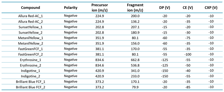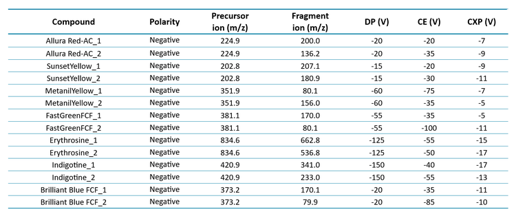- A simple sample extraction procedure and LC-MS/MS method for the analysis of 7 artificial dyes using the QTRAP 6500+ system