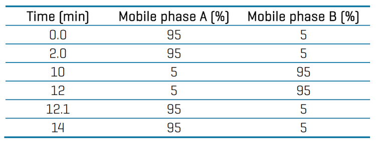 LC chromatography: Chromatographic separation was performed using an ExionAD LC system and a Phenomenex Luna Omega Polar C18 column (3.0 µm, 100 x 2.1 mm, P/N: 00D-4760-AN). Mobile phase A was water with 20mM ammonium formate, and mobile phase B was methanol. The runtime was 14 min using the gradient conditions presented in Table 1. The flow rate was 500 µL/min, the injection volume was 5 µL, and the column oven temperature was set to 40°C.