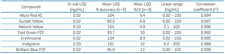 - Method sensitivity using the QTRAP 6500+ system. In-vial limits of quantitation (LOQs) ranged from 0.02 to 0.2 ng/mL for all the targeted artificial dye compounds in the neat solvent standard