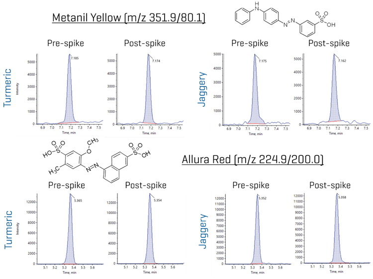 The method performance was evaluated through matrix spikes in turmeric and jaggery sugar at 100 ng/g, 500 ng/g and 5000 ng/g (n=3 per spiking level). The absolute recovery was calculated as the ratio of the mean pre- to post-extraction area count. The pre-to-post spiked recovery data set is presented in Table 4 and Figure 3 shows representative extracted ion chromatograms (XICs) for Allura Red AC and Sunset Yellow at the 100 ng/g spike level. The absolute recoveries ranged from 80.2% to 104% in the turmeric spikes, and from 89.4% to 107% in the jaggery sugar spikes, calculated from the quantifier transition at 3 spiking levels. These results demonstrate good method extraction recovery in the two matrices evaluated.
