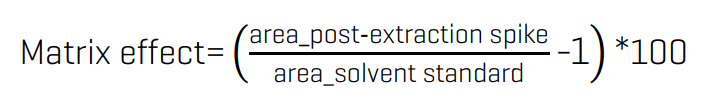 The matrix effects were evaluated by comparing the response of the 500 ng/g post-extraction matrix spike to the equivalent solvent standard (1.5 ng/mL) using the equation: