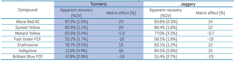 - Accurate and precise quantitation in turmeric and jaggery matrices. Matrix spikes at 100 ng/g, 500 ng/g, and 5000 ng/g in turmeric and jaggery demonstrated absolute recoveries between 80-107%, the apparent recoveries between 48-95% with precision <5%CV