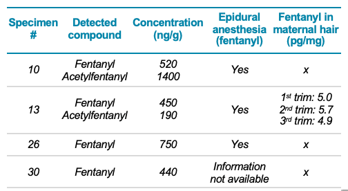 The fourth fentanyl-positive specimen was a case in which fentanyl was not found in the maternal hair. Information regarding the use of fentanyl during epidural anesthesia was not available. These data suggest either administration of fentanyl during labor or illicit intake during pregnancy. The maternal hair tested positive for MDMA in the first trimester of pregnancy at a concentration of 162 pg/mg, suggesting the mother was a chronic drug user.