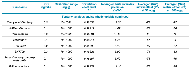 Of the various populations exposed to NPS, pregnant women are among the most vulnerable to the harmful effects of these substances. Prenatal or in utero NPS exposure presents considerable health risks for both the carrying mother and the developing fetus and has been associated with conditions such as neonatal abstinence syndrome (NAS), birth defects, low birth weight, preterm delivery and other long-term neurodevelopmental disorders that affect brain structure and function.2-5 Meconium, which is a newborn’s first stool, is considered the best matrix for detecting prenatal drug exposure. Although complex in composition, meconium provides a wide detection window that covers the second and third trimesters of pregnancy.6-7 Therefore, reliable screening methods capable of identifying and quantifying drug use in meconium samples provide unequivocal evidence of prenatal exposure to NPS and synthetic opioids.
